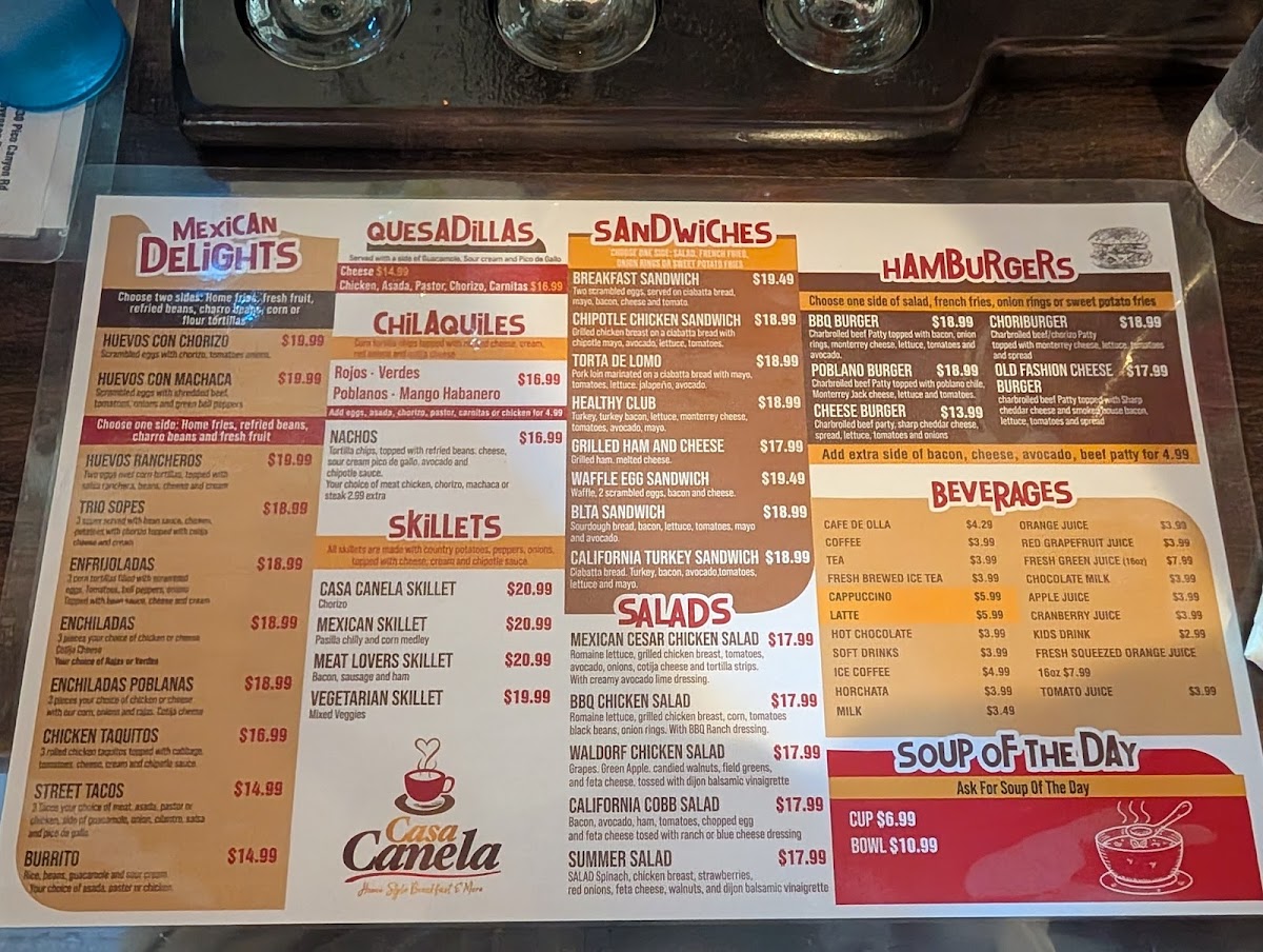 Enchiladas poblanos: three pieces your choice of chicken or cheese with our casa canela poblano sauce topped with rajas and cream.
