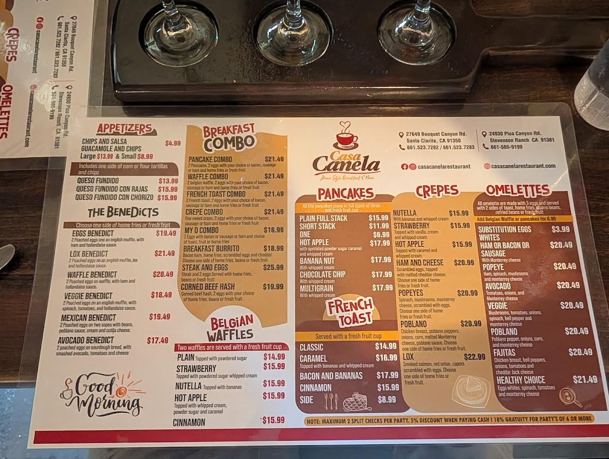 2 panckes, 2 eggs with your choice of bacon, sausage or ham and homefries or fruit.