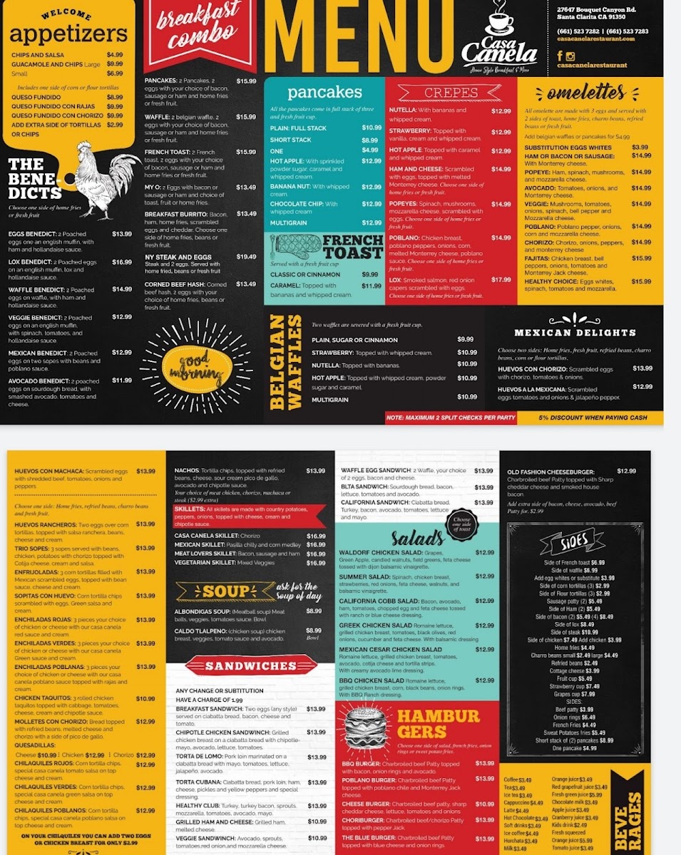 All skillets are made with country potatoes, bellpeppers, onions, topped with cheese, sourcream, and chipotle sauce.